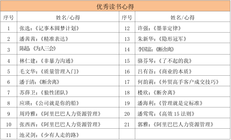 本次為第四季度讀書心得評(píng)選活動(dòng),經(jīng)總裁辦校對(duì)、審核,從100多篇心得中初選出35篇,再根據(jù)主題明確、立意新穎、結(jié)合工作實(shí)際、文字通順完整等篩選出22篇優(yōu)秀心得,其中獲得本季度“最佳讀書心得”得主是生產(chǎn)部蔡云峰《不清單革命》。其余優(yōu)秀文稿如下: