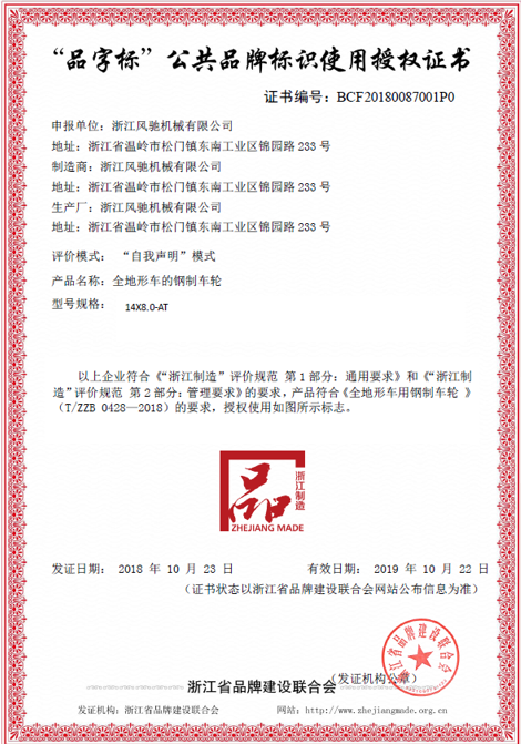我司是在去年積極響應(yīng)浙江制造品牌建設(shè),在完成上一階段浙江制造團(tuán)體標(biāo)準(zhǔn)《全地形車用鋼制車輪》(T/ZZB 0428-2018)的申報(bào)、審批與發(fā)布實(shí)施后,在此基礎(chǔ)之上,于2018年9月份申報(bào)了“品字標(biāo)公共品牌標(biāo)識(shí)”,通過“自我申明”評(píng)價(jià)模式及資質(zhì)審核,順利通過評(píng)審,獲得了“品字標(biāo)”公共品牌標(biāo)識(shí)使用證書。